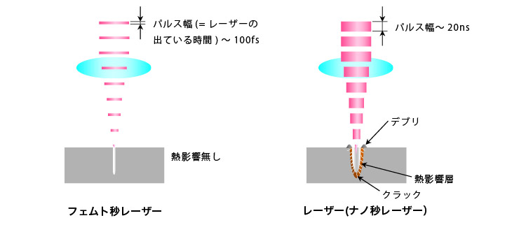 | 項目 | フェムト秒レーザー(fs) | ナノ秒レーザー(ns) |
