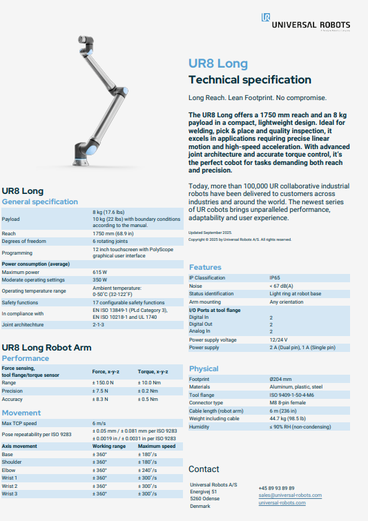 UR8e Longは、1750mmのロングリーチと最大8kgの可搬重量を実現した最新モデルです。詳細な技術仕様をまとめたカタログデータシートをダウンロードいただけます。